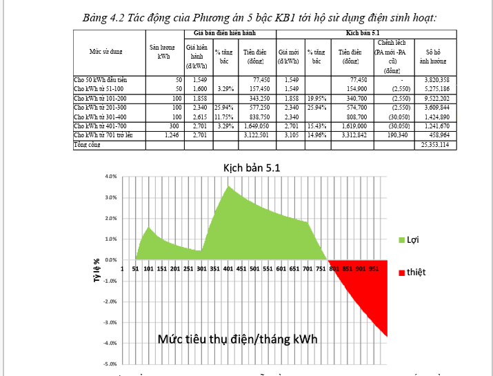 Với kịch bản này, số tiền ngân sách hỗ trợ cho hộ nghèo và hộ chính sách xã hội không thay đổi so với hiện hành, mức tăng giá giữa các bậc hợp lý, chênh lệch giữa bậc đầu và bậc cuối cùng là 2 lần, phù hợp với xu thế chung của các nước trên thế giới (ví dụ như mức chênh lệch ở Mỹ là 2,2 lần, Hàn Quốc 3 lần, Lào 2,88 lần; Thái Lan 1,65 lần). Với kịch bản này, số tiền điện chênh lệch các hộ phải chi trả đều giảm, trừ các hộ sử dụng trên 700kWh.