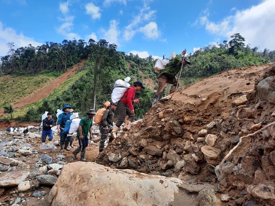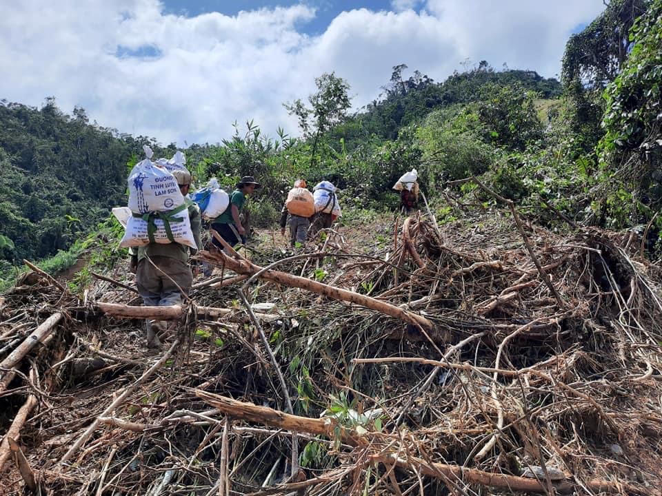8 tấn hàng đầu tiên được gùi cõng bằng đường bộ chuyển đến cứu trợ người dân vùng cô lập xã Phước Thành, huyện Phước Sơn, tỉnh Quảng Nam chủ yếu là gạo, nhu yếu phẩm thiết yếu.