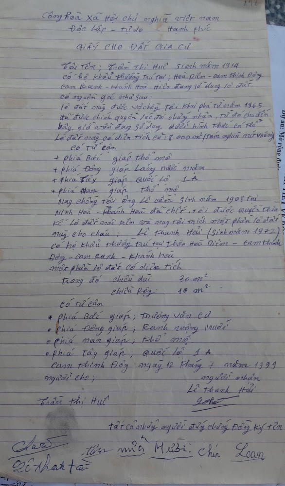 Theo hồ sơ, năm 1965, vợ chồng cụ Trần Thị Huê (là cha mẹ ông Tài, ông bà nội anh Hải) tạo lập được khoảng 4.000 m2 đất đường QL1A, đoạn qua thôn Hòa Diêm, xã Cam Thịnh Đông.