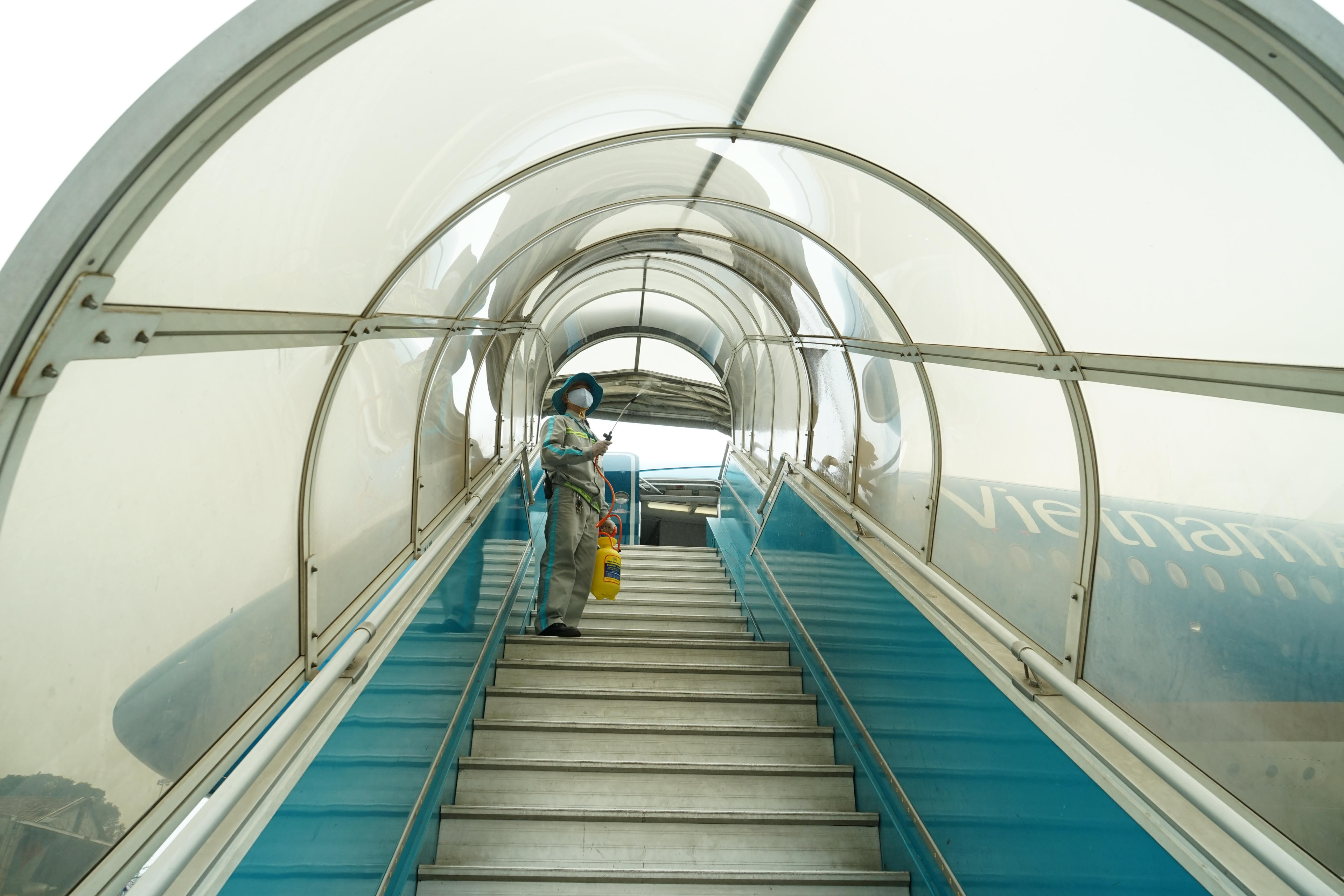 Khử trùng lan can, mui che ống lồng xe thang – vị trí hàng trăm khách tiếp xúc trên chuyến bay mỗi ngày.