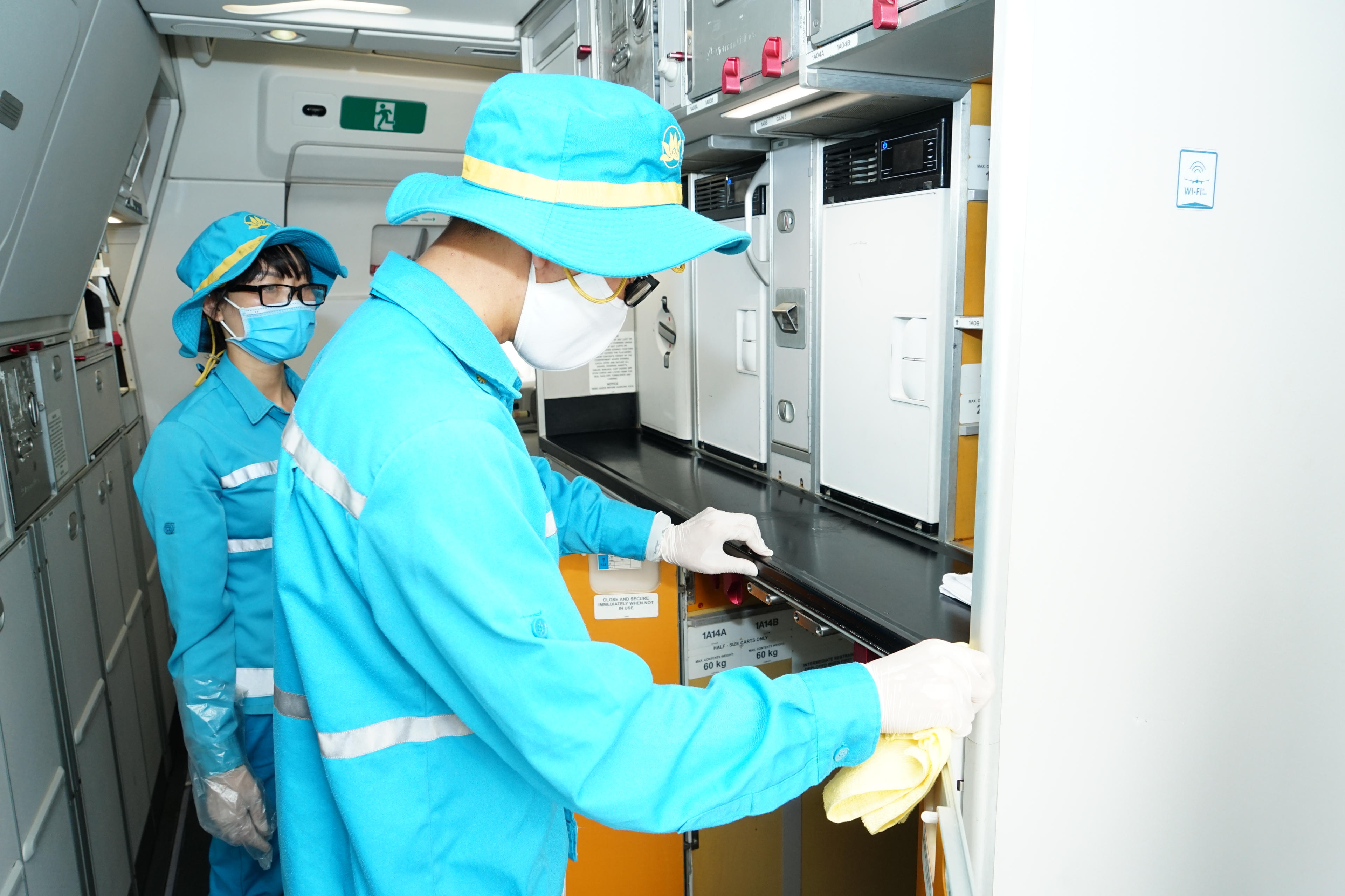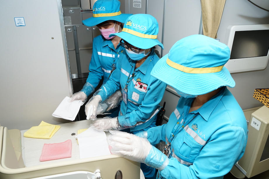 Toàn bộ khoang hành khách, phòng vệ sinh, bếp…trên máy bay đều được vệ sinh khử trùng. Các nhân viên vệ sinh được bảo hộ bằng khẩu trang kháng khuẩn, găng tay hai lớp và mũ.