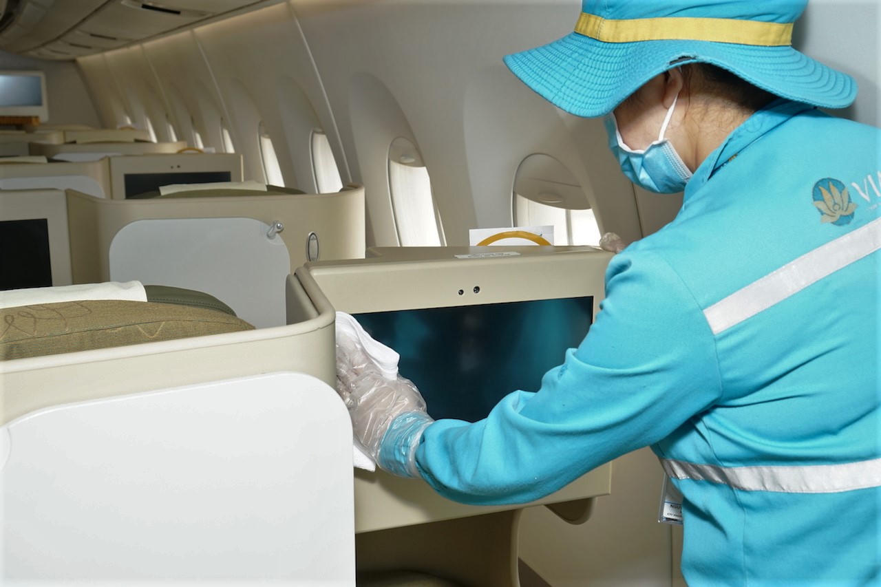 Việc vệ sinh được tập trung đặc biệt các vật dụng, vị trí khách tiếp xúc bằng tay như bàn ăn, thanh để tay, màn hình giải trí, tai nghe…