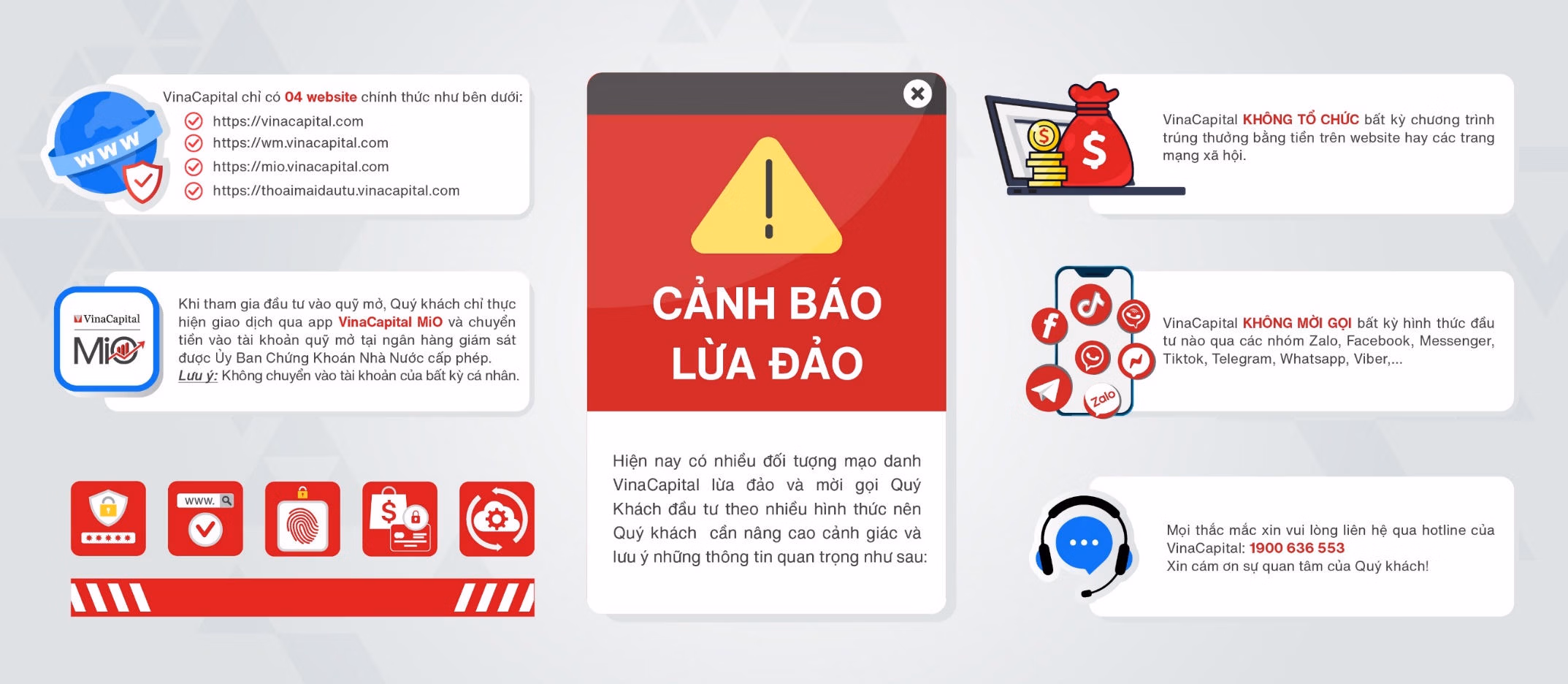 Trong thời gian qua, chúng tôi cũng liên tục đăng tải những cảnh báo trên các kênh truyền thông chính thức của VinaCapital nhằm giúp Quý khách nâng cao cảnh giác, thận trọng, kiểm tra kỹ thông tin trước khi thực hiện bất kỳ giao dịch nào.