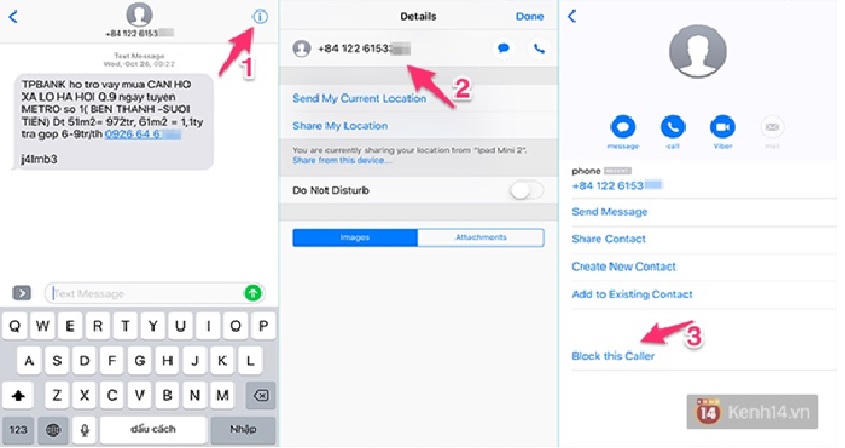 Mở ứng dụng nhắn tin lên và chọn vào một tin nhắn rác bất kỳ. Sau đó, chạm vào biểu tượng chữ "i" ở góc trên bên phải, tiếp tục chọn vào số liên lạc và cuối cùng nhấp vào Block this Caller (Chặn người gọi này).