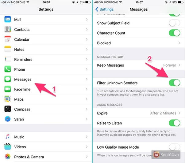 Truy cập vào phần Settings (Cài đặt) / Messages (Tin nhắn), sau đó kích hoạt ON ở tùy chọn Filter Unknown Senders (lọc người gửi không xác định). Sau khi bật tính năng này, Imessage sẽ không hiển thị thông báo và chuyển tin nhắn của những người gửi không nằm trong danh bạ vào một thư mục riêng biệt. Tính năng này cơ bản không thể ngăn chặn việc nhận các tin nhắn này mà chỉ phần nào giúp giảm bớt phiền toái cho người dùng.