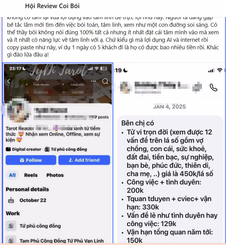 Những ngày sau Tết, trên Facebook, Zalo, TikTok xuất hiện dày đặc các hội, nhóm xem bói trực tuyến với hàng nghìn thành viên tham gia. Qua theo dõi, lực lượng chức năng ghi nhận nhiều tài khoản giả mạo, tự xưng là “thầy bói”, “cô đồng”, “chuyên gia phong thủy”, “xem căn duyên, tiền kiếp”… để tạo lòng tin.