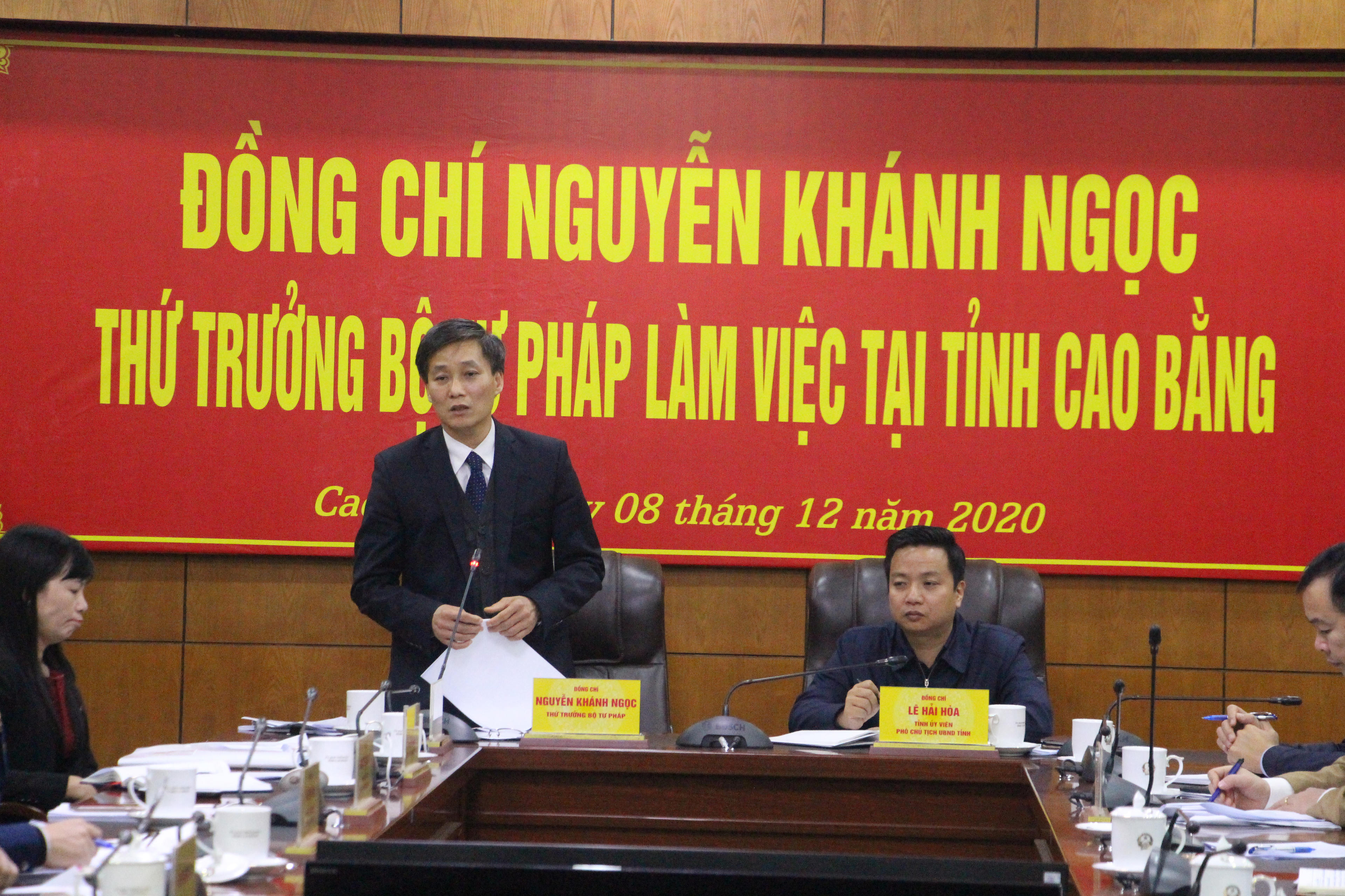 Phát biểu tại buổi làm việc, Thứ trưởng Bộ Tư pháp Nguyễn Khánh Ngọc chúc mừng những thành tích Đảng bộ, chính quyền và nhân dân tỉnh Cao Bằng đã đạt được đồng thời chia sẻ những khó khăn mà Tỉnh nhà đã và đang gặp phải. Thứ trưởng cũng đánh giá cao cơ quan tư pháp đã thực hiện cơ bản tốt vai trò tham mưu giúp HĐND, UBND trong công tác xây dựng, ban hành các văn bản quy phạm pháp luật; Hoạt động trợ giúp pháp lý, nhất là trợ giúp pháp lý trong hoạt động tố tụng được chú trọng, tăng cường chất lượng từng bước được nâng lên.