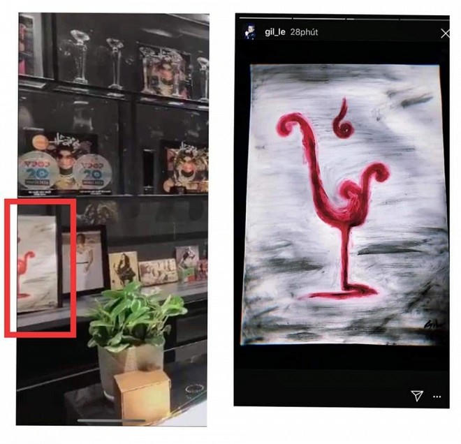 Bức tranh xuất hiện trong phòng làm việc của Hoàng Thùy Linh không biết vô tình hay hữu ý mà lại giống với bức tranh được Gil Lê khoe với người hâm mộ trên Instagram. Cư dân mạng cho rằng hai bức tranh này là 1 và chính là vật trang trí trong ngôi nhà chung của Gil Lê và Hoàng Thùy Linh. Điều này được coi như thêm một bằng chứng "cặp đôi" sống chung với nhau.