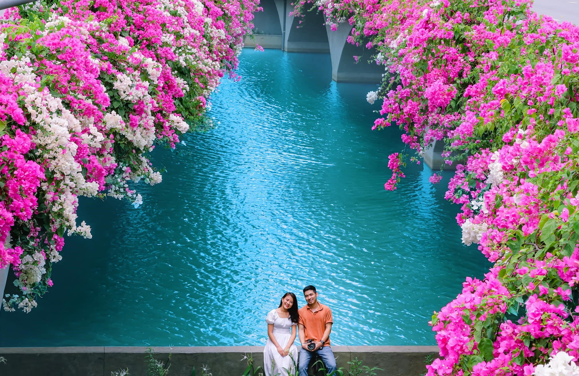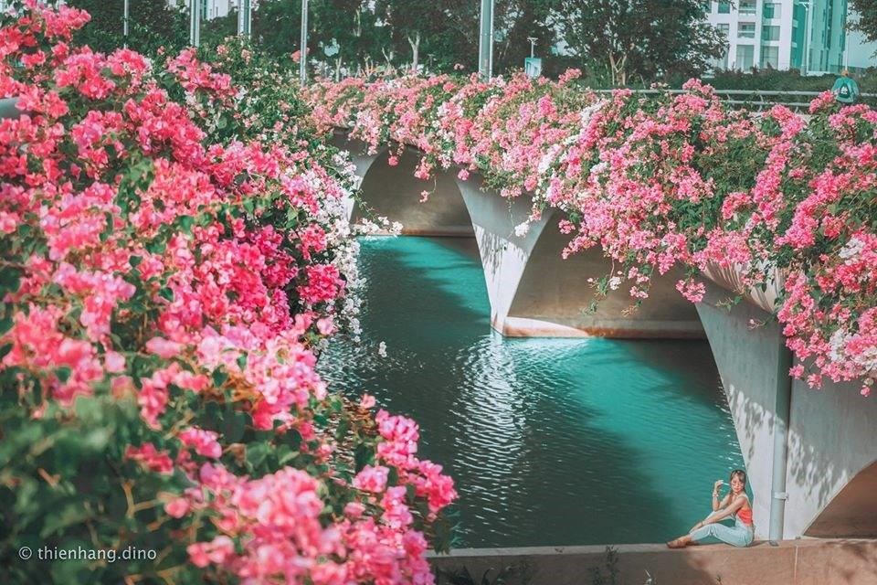 Do thiết kế cầu có hai làn sóng đôi, ở giữa có khoảng hở nhìn xuống mặt nước và phía chân cầu có điểm nghỉ để du khách check-in, nên nếu đứng ở đúng điểm giữa hai làn cầu này, sẽ ngắm được trọn vẹn khung cảnh hoa giấy phủ kín hai thành cầu, xõa bóng xuống mặt nước đẹp hút mắt.