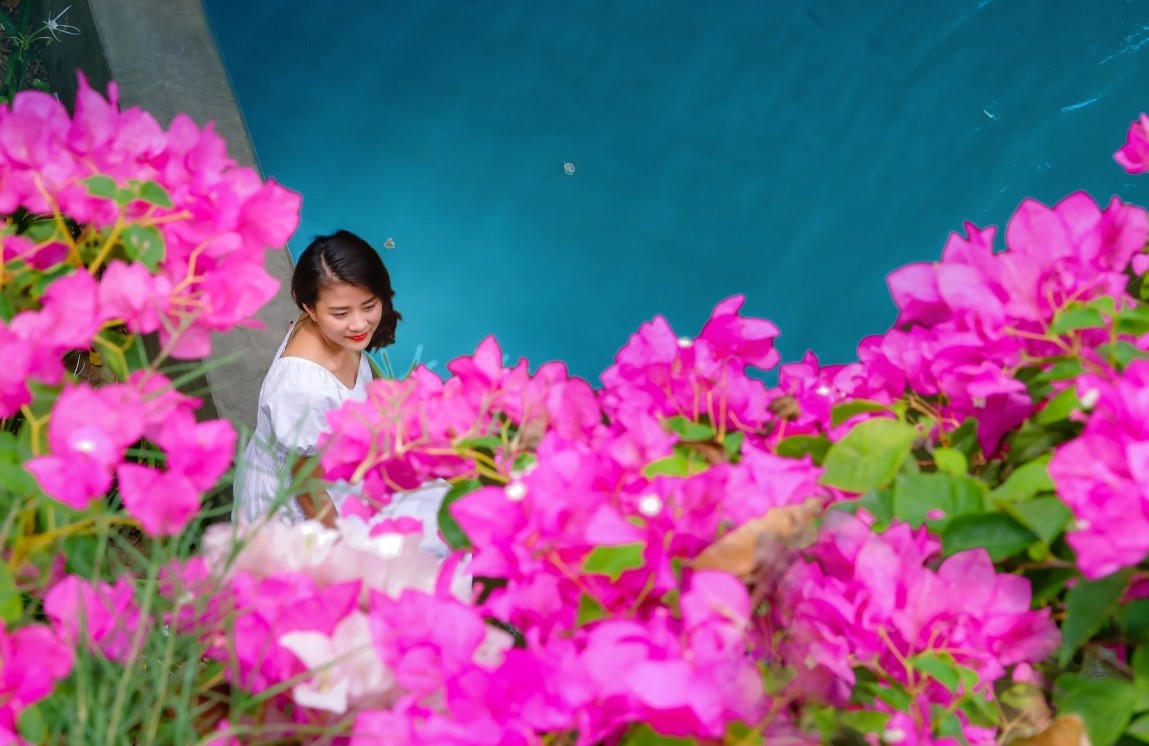 Những bông hoa giấy rực rỡ nở trên nền mặt nước trong xanh giúp người chụp thu được những tấm hình đẹp khác lạ |