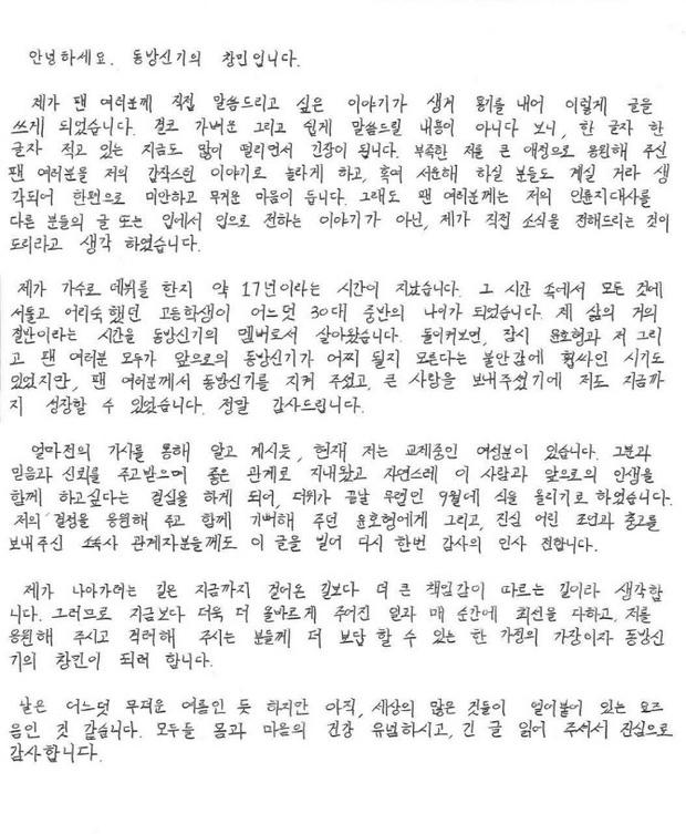 Changmin còn gửi lời cảm ơn đặc biệt đến Yunho (DBSK) vì đã ủng hộ quyết định của anh và chúc phúc cho người bạn lâu năm, đồng thời cảm ơn công ty SM Entertainment vi đã đưa ra lời khuyên chân thành.