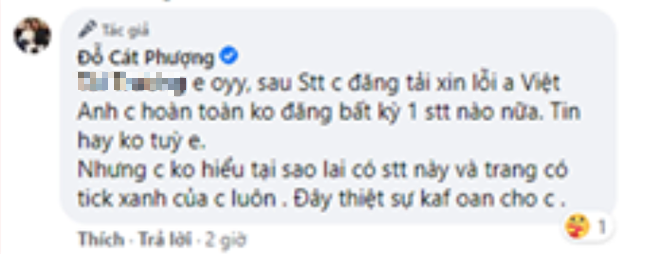 Nữ diễn viên 50 tuổi đã thanh minh khi trả lời bình luận của một fan. Cô cho hay: "Sau status chị đăng tải xin lỗi anh Việt Anh chị hoàn toàn không đăng bất kỳ 1 status nào nữa. Tin hay không tuỳ em. Nhưng chị không hiểu tại sao lại có status này và trang có tick xanh của chị luôn. Đây thiệt sự là oan cho chị". Tuy nhiên, bình luận này cũng nhanh chóng biến mất khỏi trang cá nhân của Cát Phượng khiến fan không biết nên tin vào ai.