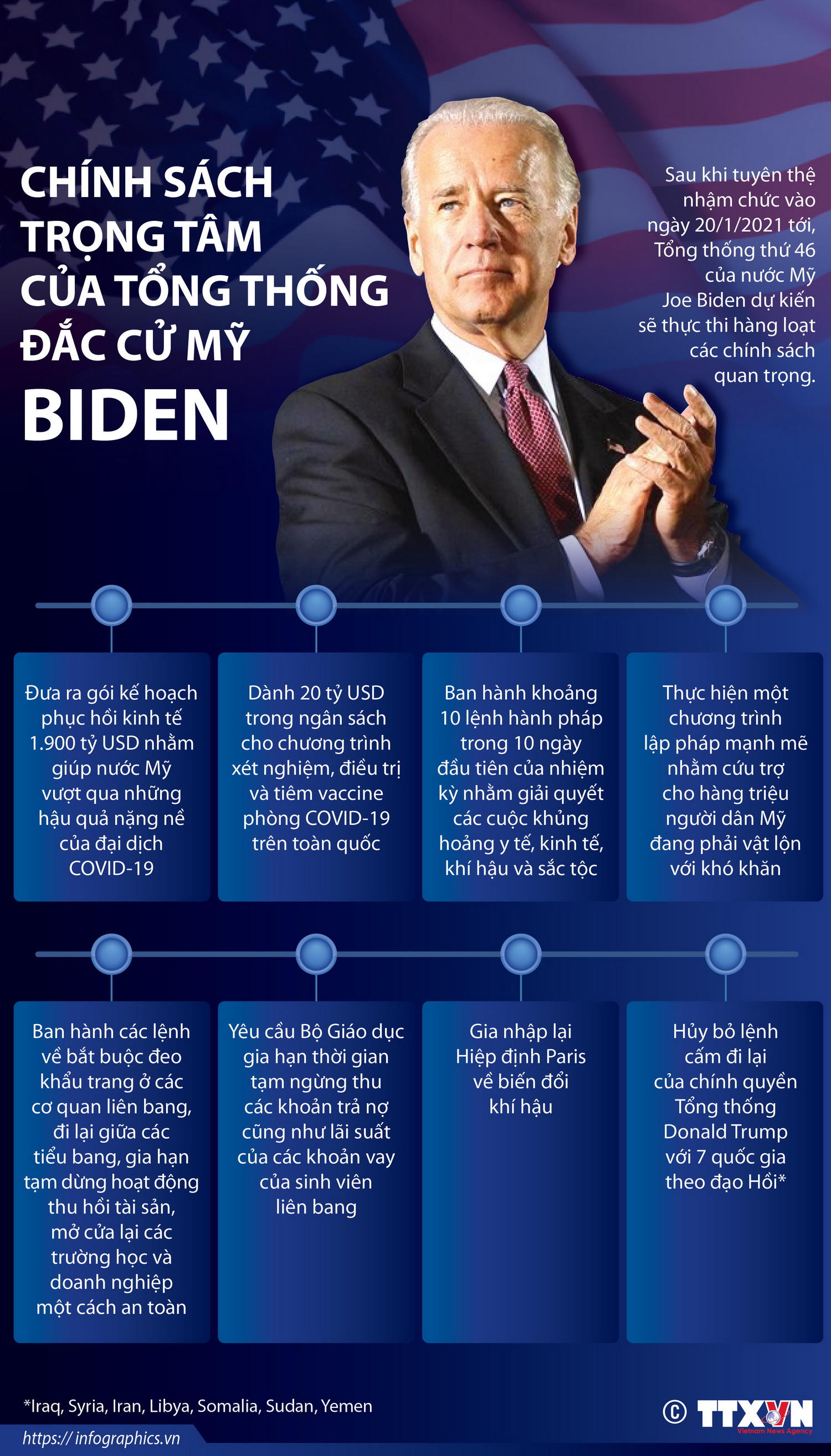 (PLVN) - Sau khi tuyên thệ nhậm chức vào ngày 20/1 tới, Tổng thống thứ 46 của nước Mỹ Joe Biden dự kiến sẽ thực thi hàng loạt các chính sách quan trọng.