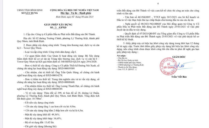 Chính vì những lý do trên, dự án chậm được cấp Giấy phép xây dựng trong quá trình triển khai. Công ty Đô Thành sau đó đã gửi bổ sung hồ sơ đến UBND tỉnh Bình Định để xin cấp Quyết định chủ trương đầu tư dự án theo Luật Đầu tư mới. Bộ Xây dựng đã tiến hành thẩm định dự án và ngày 2/4 vừa qua Giám đốc Sở Xây dựng tỉnh Bình Định đã chính thức cấp Giấy phép xây dựng số 21/GPXD cho dự án I – Tower Quy Nhơn.