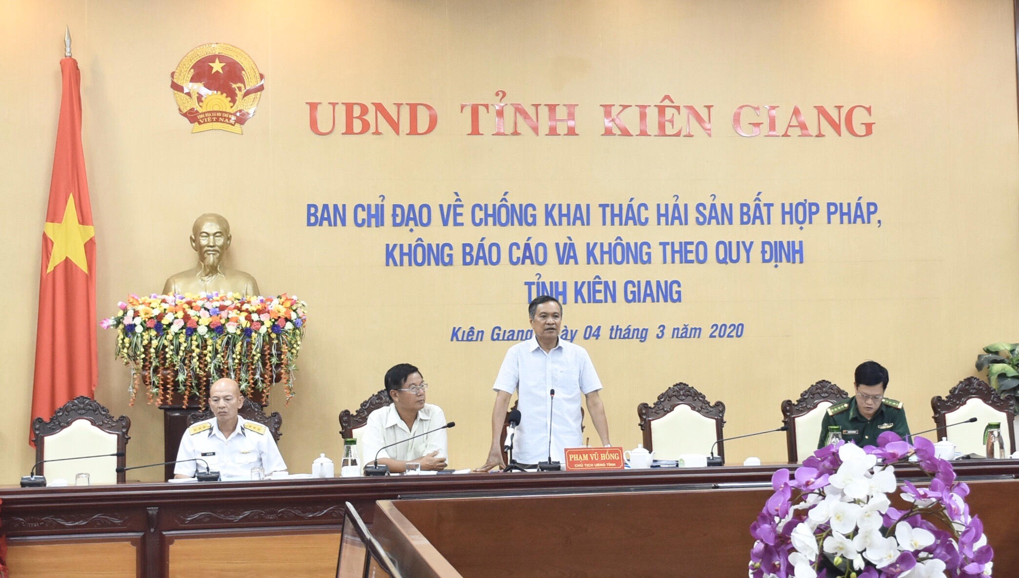 Phát biểu chỉ đạo tại cuộc họp, Phó Bí thư Tỉnh ủy, Chủ tịch UBND tỉnh Kiên Giang Phạm Vũ Hồng đề nghị thành viên Ban chỉ đạo cũng như các địa phương có tàu cá vi phạm cần phải tăng cường hệ thống giám sát và quản lý giám sát đối với các tàu cá đang hoạt động trên biển, khẩn trương tiến hàng lắp đặt thiết bị giám sát hành trình đối với các tàu chưa lắp đặt theo quy định. Tăng cường thực hiện thanh, kiểm tra, kiểm soát hoạt động của các tàu cá trên biển và cập bến lên cá, kiên quyết xử lý nghiêm các tàu cá vi phạm theo Nghị định số 42/2019/NĐ-CP của Chính phủ.