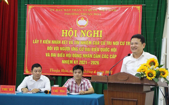(PLVN) - 100% cử tri tại tổ dân phố 6, phường Thuận Hoà, TP Huế đã biểu quyết, nhất trí với ông Hoàng Hải Minh (Tỉnh uỷ viên, Phó Bí thư Thành uỷ, Chủ tịch UBND TP. Huế) ứng cử đại biểu HĐND tỉnh và đại biểu HĐND TP nhiệm kỳ 2021 - 2026