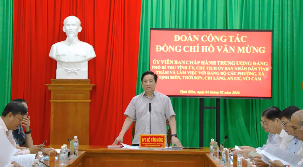 Chủ tịch UBND tỉnh An Giang yêu cầu lãnh đạo các phường, xã tiếp tục quán triệt, tuyên truyền sâu rộng Nghị quyết Đại hội đại biểu toàn quốc lần thứ XIV của Đảng, nhiệm kỳ 2026 - 2031; xây dựng lộ trình cụ thể theo tinh thần “6 rõ” trong việc triển khai các Nghị quyết của Trung ương, Nghị quyết Đảng bộ tỉnh và các Chương trình hành động của Tỉnh ủy, đảm bảo khai thác hiệu quả tiềm năng kinh tế biên giới và lợi thế du lịch của khu vực Núi Cấm theo hướng bền vững, văn minh, gắn với bảo vệ cảnh quan, môi trường sinh thái và giữ gìn bản sắc văn hóa các dân tộc.