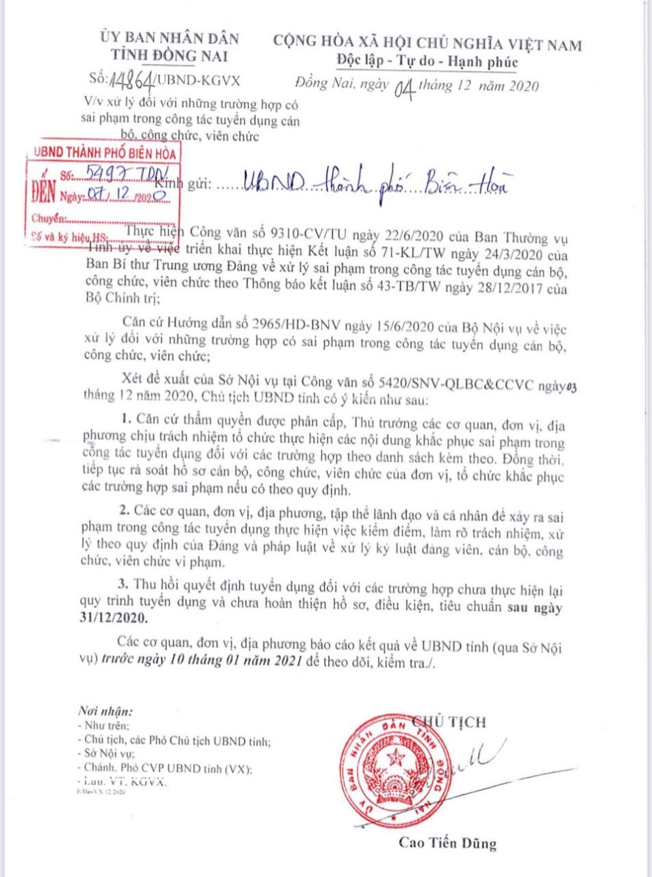 Chủ tịch UBND tỉnh Đồng Nai chỉ đạo xử lý sai phạm trong công tác tuyển dụng