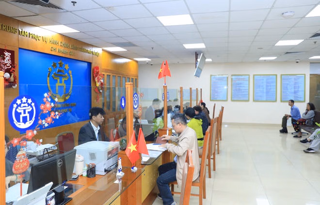 Không khí làm việc tại Trung tâm Phục vụ hành chính công TP Hà Nội - Chi nhánh số 3 sáng 23/2. (Ảnh: UBND Hà Nội)