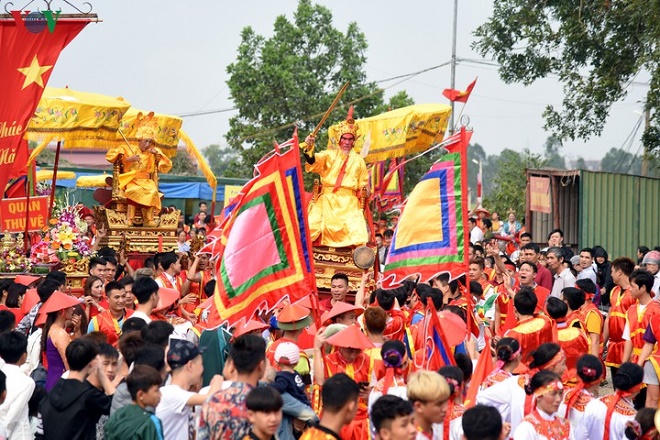 Lễ bái xong, vua chúa mới được rước trên kiệu. Đám rước đi trong tiếng nhạc của phường bát âm và tiếng chiêng trống trầm hùng trang nghiêm mà vẫn nhộn nhịp tưng bừng. Khi đến cánh đồng Chầu, vua làm lễ bái vọng đức thánh Huyền Thiên trên đền Sái rồi cùng các quan trở về đình. Đình làng trang trí lộng lẫy, cờ xí rợp trời, dinh vua đóng trong sân đình, dinh chúa đặt ngoài đình.