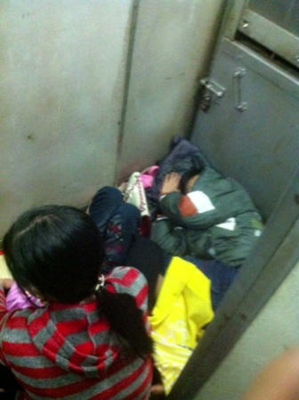 Vị trí của đám đi “tàu chui”, sau khi “làm luật” hết 250 ngàn, ai may mắn thì có cái ghế nhựa ngồi trên giữa lối đi, để chốc chốc phải nhổm dậy tránh đường cho nhân viên đường sắt hoặc hành khách đi vệ sinh. Còn lại thì đứng, ngồi la liệt ở khoảng giữa 2 toa, trước cửa toa - lét.