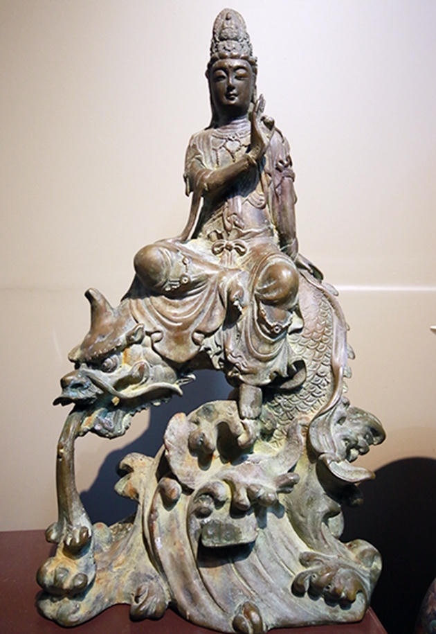 Bức tượng bằng đồng, nặng khoảng 7 kg, cao 45 cm và rộng gần 30 cm, được đánh mã số 95/KL.69. Bức tượng Quan Thế Âm Bồ Tát ngồi trên bệ là lưng của một con cá hóa rồng với một chiếc sừng ở trên đầu. Trên đầu đức Bồ Tát độ mũ Quan Âm có tượng Phật A Di Đà nổi trên lá đề và hoa. Cổ đức Phật có đeo trang sức, thân mặc pháp y được gấp nhiều nếp. Tay phải của Ngài cầm Định hải châu, tay trái đặt trên lưng rồng. Chân trái đạp trên sóng nước, chân phải xếp bằng. Theo phiếu giám định cổ vật, bức tượng có xuất xứ tại Việt Nam với niên đại khoảng cuối thế kỷ 19.