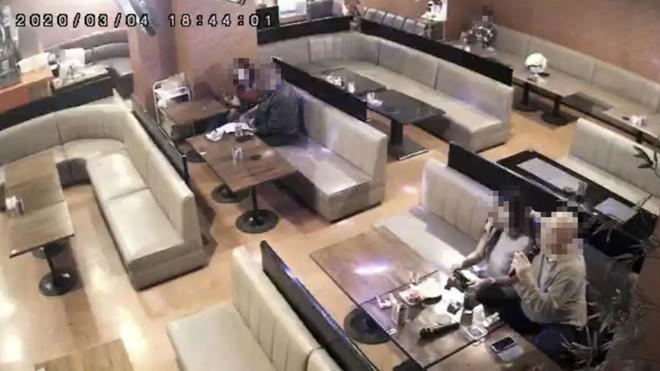 Hình ảnh do camera an ninh ghi lại cho thấy người đàn ông bị COVID-19 (góc phải) giải trí cùng tiếp viên nữ tại quán rượu ở Gamagori (Ảnh Kyodo News)