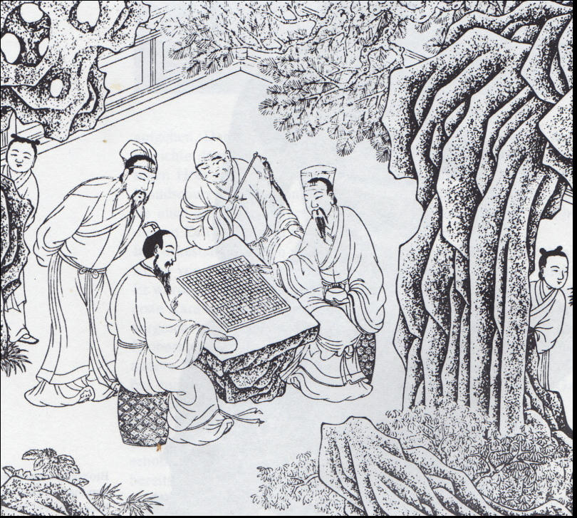 Một vị tiên nói: “Đan Chu hay tranh giành mà lại ngu ngốc, hãy dùng những phương diện gì hắn có sở trường mà uốn nắn tính tình của nó theo con đường tốt”. Còn vị tiên kia lấy tay chỉ những đường kẻ trên cát và các viên đá đen trắng nói rằng: “Cái này gọi là bàn cờ Vi Kỳ. Bàn cờ này hình vuông mà yên tĩnh, trong khi những viên đá kia hình tròn mà chuyển động. Nó đi theo cách vận chuyển của Trời và Đất.