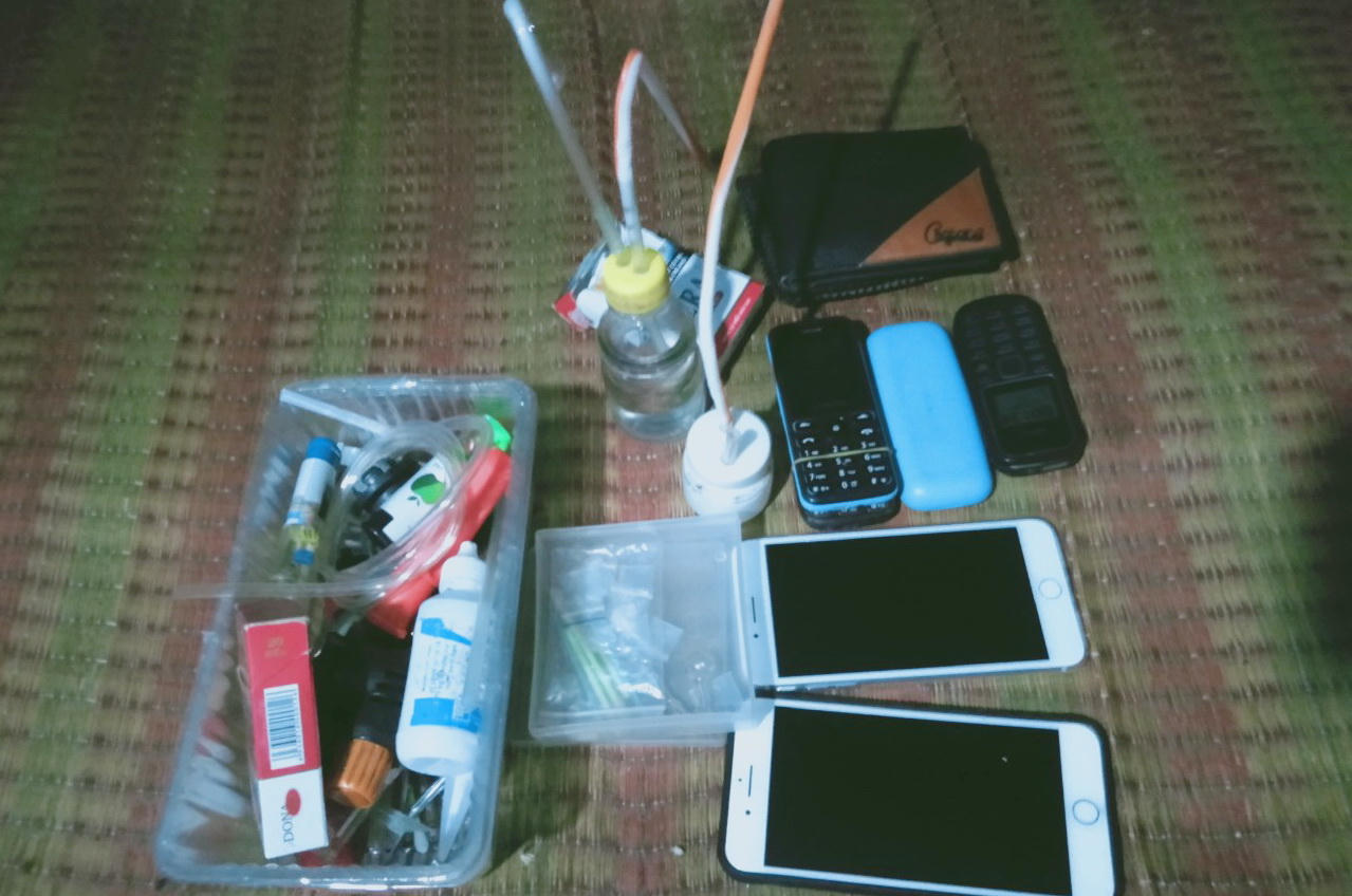 Tang vật thu giữ tại hiện trường gồm có: 2 gói ni long màu trắng đục được hàn kín, bên trong có chứa nhiều hạt tinh thể màu trắng, dạng rắn (nghi là ma túy), 1 bộ dụng cụ dùng để sử dụng chất ma túy, 4 chiếc xe gắn máy, hơn 400 ngàn đồng tiền mặt và nhiều tang vật có liên quan khác.
