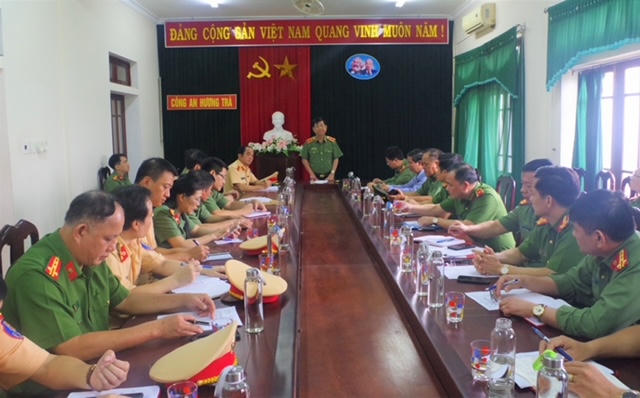 Thay mặt Đảng ủy, Ban Giám đốc Công an tỉnh, Thưởng tá Nguyễn Thanh Tuấn, Giám đốc Công an tỉnh đã tiếp thu những ý kiến đánh giá của Lãnh đạo Bộ Công an, đồng thời báo cáo về những thiệt hại trong đợt mưa lũ vừa qua trên địa bàn TT Huế và tình hình sạt lở cũng như công tác tìm kiếm, cứu hộ cứu nạn đã triển khai tại Thủy điện Rào Trăng và thủy điện Alin B2. Đồng chí cũng nếu những khó khăn về con người, phương tiện mà Công an tỉnh đang phải đối mặt; đồng thời đề xuất Bộ Công an hỗ trợ, trang cấp một số phương tiện, lực lượng cần thiết phục vụ cho công tác tìm kiếm, cứu hộ cứu nạn cũng như lực lượng Công an cơ sở làm nhiệm vụ như điện thoại vệ sinh, bộ đèn kĩ thuật số, máy phát điện…