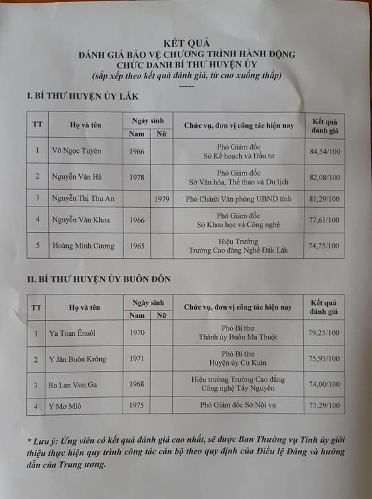 Đối với 5 người tham dự chức danh Bí thư Huyện ủy Lắk, ông Võ Ngọc Tuyên (SN 1966, Phó Giám đốc Sở KH&ĐT) được điểm cao nhất - 84,54/100 điểm.