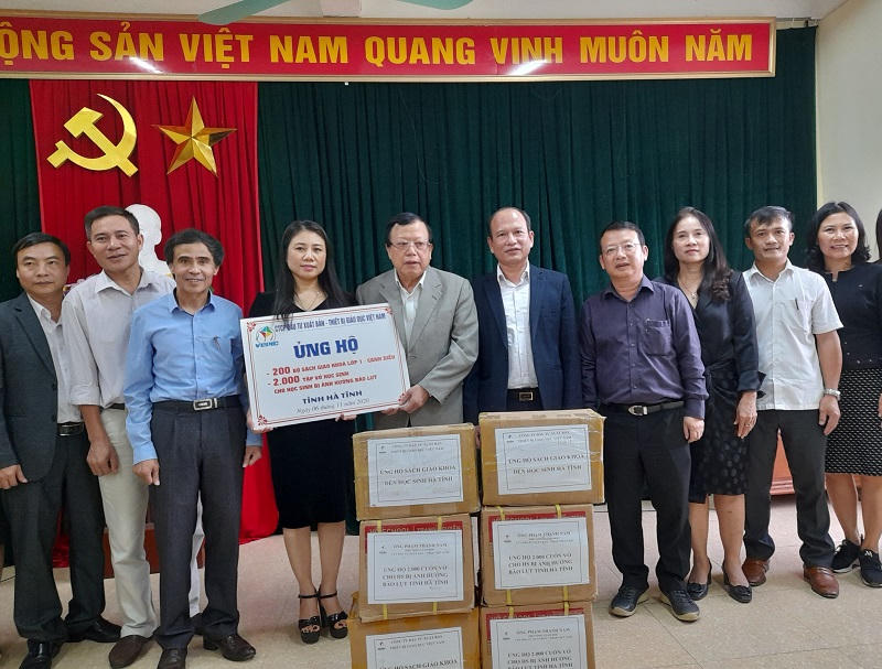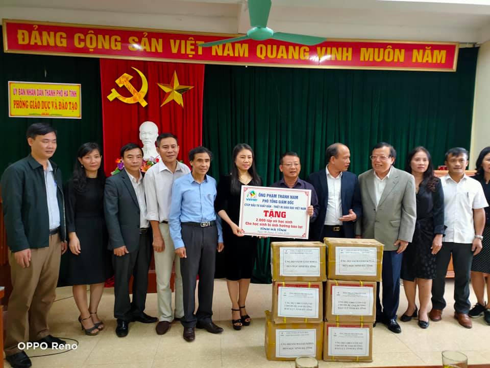 Cùng ngày, NGƯT Ngô Trần Ái cùng đoàn đã đến Phòng GD&ĐT thành phố Hà Tĩnh, thăm hỏi, động viên CB, GV, học sinh bị ngập lũ. Tại đây, Đoàn đã trao 200 bộ sách giáo khoa lớp 1 Cánh Diều và hàng ngàn cuốn vở cho các em học sinh vùng rốn lũ. Cũng tại Phòng GD&ĐT Thành phố Hà Tĩnh, Phó TGĐ Phạm Thanh Nam Công ty cổ phần Đầu tư Xuất bản – Thiết bị Giáo dục Việt Nam đã tặng học sinh trên địa bàn 2000 tập vở, nhằm hỗ trợ các em vùng lũ khắc phục khó khăn trong học tập.