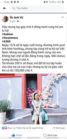 Cụ thể, đây là chương trình 'Đồng hành góp 100 nghìn chữ A' do Mạng lưới Tự kỷ Việt Nam phát triển. Từ ngày 10/3, mỗi bài đăng trên facebook gắn 3 hashtag bắt đầu bằng chữ A là #autism, #awareness, #a365 là sẽ góp phần vào quá trình thu thập 100 nghìn chữ A.