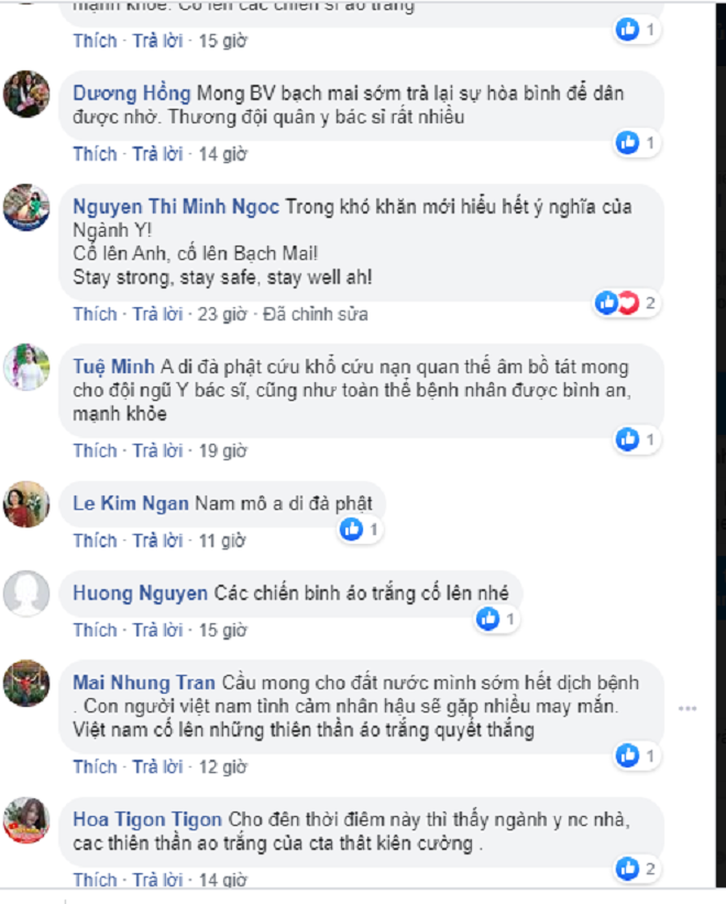 Chị Đặng Yến chia sẻ: “Mình đã sống lại 2 lần từ bệnh viện Bạch Mai. Cầu chúc bác sĩ và nhân viên bệnh viện mạnh khỏe, sớm vượt qua khó khăn để tiếp tục cứu người”. Hay đơn giản chỉ là lời động viên của độc giả Yên Hoang: “Bạch Mai chiến thắng”.