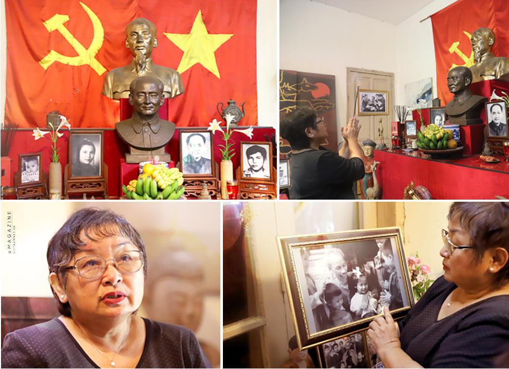 Bộ bàn ghế xưa cũ, gian phòng khách treo đầy những bức ảnh đen trắng. Bàn thờ gia tiên treo trang trọng chính giữa là cờ Tổ quốc, cờ Đảng, tiếp đến là tượng Bác Hồ và tượng nhà cách mạnh Hoàng Quốc Việt, bên dưới là ảnh những người thân.