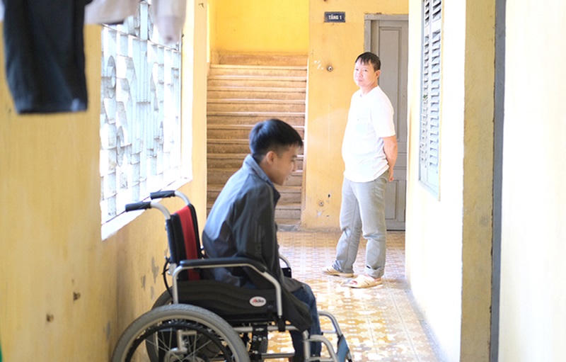 Chỉ vào chân phải của mình, ông Mây nói nhỏ: “Tôi bị gãy chân từ hồi tháng 3 do tai nạn khi làm thợ khai thác đá, đến giờ vẫn chưa được rút đinh nên leo cao không vững. Có lần cháu học ở tầng 5, tôi cõng từng tầng lại ngồi nghỉ.” Đau nhức là có nhưng nghĩ đến việc đang cùng con đồng hành trên quãng đường tri thức, được gần gũi con hơn, ông Minh lại lấy đó làm niềm vui cuộc sống.