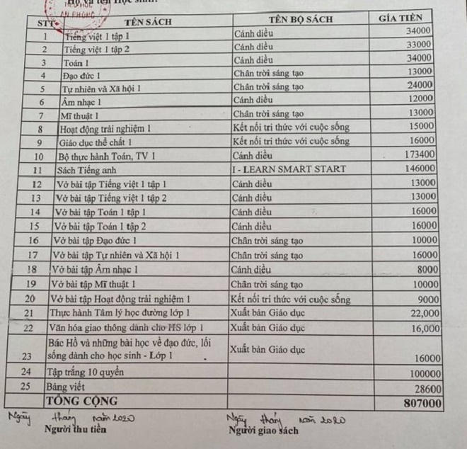 Bản thông báo của Trường tiểu học An Phong (quận 8, TP HCM) về những hạng mục sách gây tranh cãi. Có tất cả 25 hạng mục bao gồm SGK, vở bài tập, sách tiếng Anh của các bộ sách Cánh diều, Chân trời sáng tạo, Kết nối tri thức với cuộc sống (tùy môn). Ngoài ra, có sách bổ trợ, tập, bảng viết, tổng 807.000 đồng. Trong số các đầu sách, đắt nhất là sách tiếng Anh I-Learn Smart Start có giá 146.000 đồng/cuốn, bộ sách thực hành Toán, tiếng Việt 1 có giá 173.400 đồng.