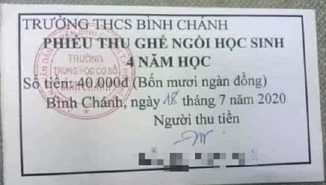 Mới đây, nhiều phụ huynh Trường THCS Bình Chánh (TP HCM) xôn xao về phiếu thu ghế ngồi học sinh. Theo đó phiếu thu được lập ngày 18/7, có đóng dấu, kèm số tiền phải đóng trong 4 năm học là 40.000 đồng/học sinh.
