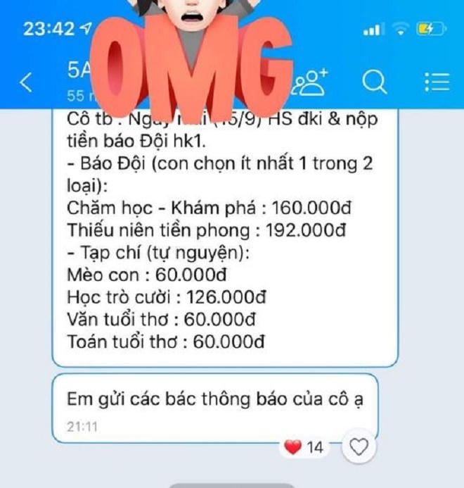 Mới đây trên mạng xã hội lan truyền một tin nhắn được cho là của nhóm phụ huynh học sinh về việc nộp tiền cho con. Trong đó, đáng chú ý là việc Báo đội (chọn 1 trong 2 loại) Chăm học – khám phá: 160.000 đồng hoặc Thiếu niên tiền phong là 192.000 đồng.
