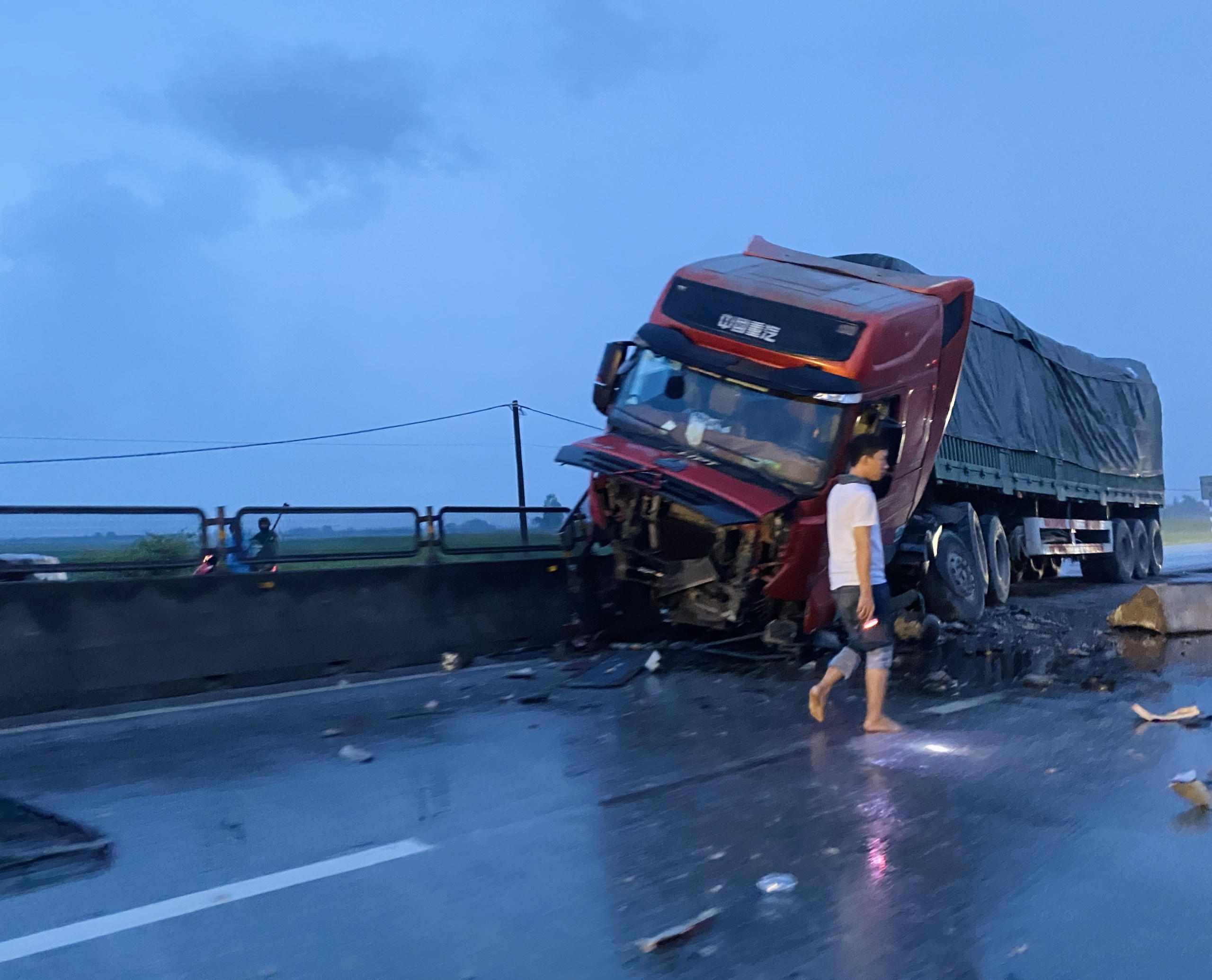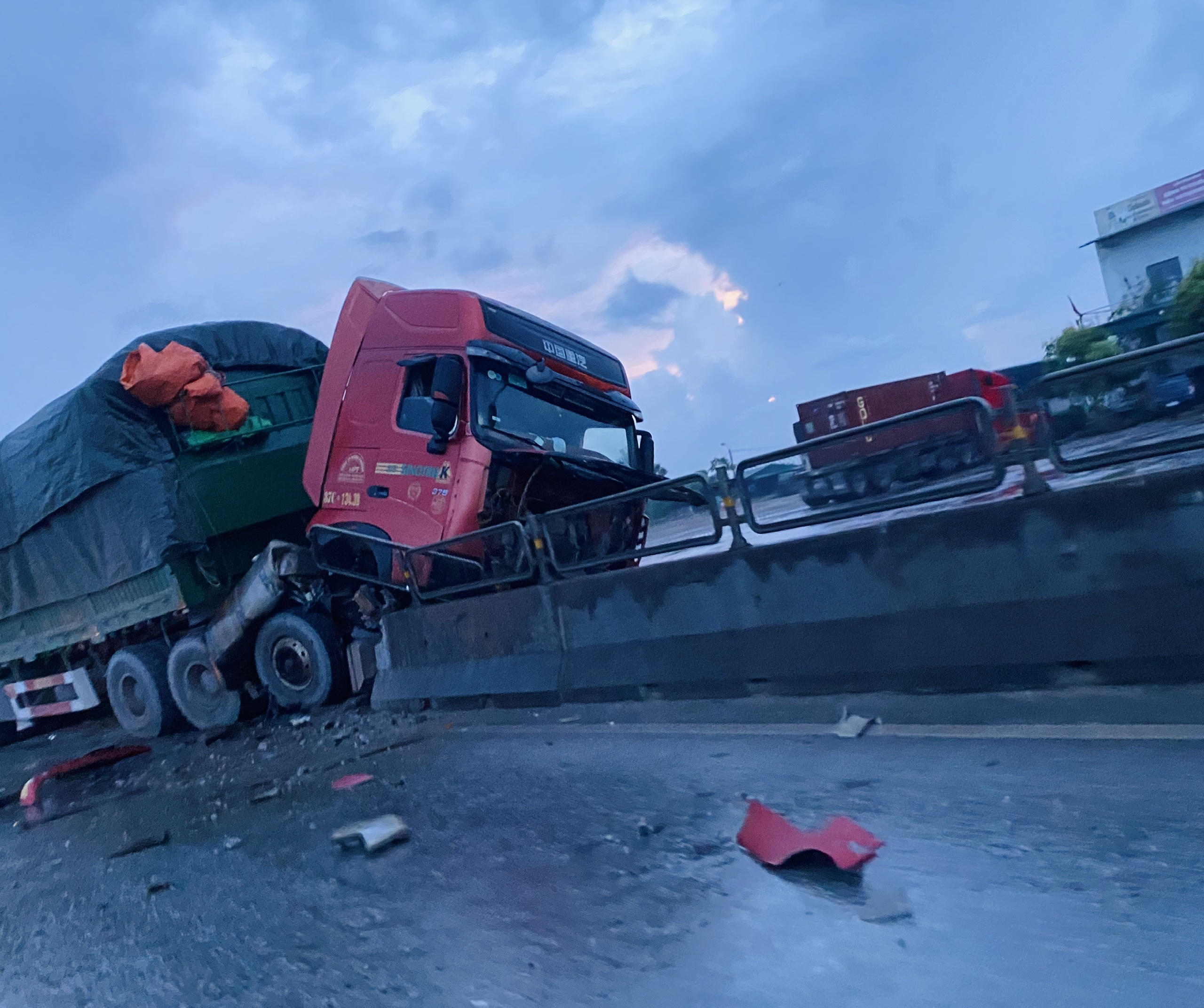 Tại hiện trường, chiếc xe container húc baymột đoạn dải phân cách, đầu xe nằm trên dải phân cách giữa đường.