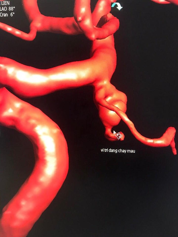 Kết quả chụp mạch não phát hiện một túi phình mạch não phía bên phải kích thước 5mmx3mm, động mạch mang phình uốn cong nhiều đoạn và đặc biệt nguy hiểm do túi phình đang chảy máu. Nhận định đây là một tình huống cấp cứu, phải khẩn trương tối đa, vì chỉ cần chậm trễ vài phút là tính mạng bệnh nhân sẽ gặp nguy hiểm.