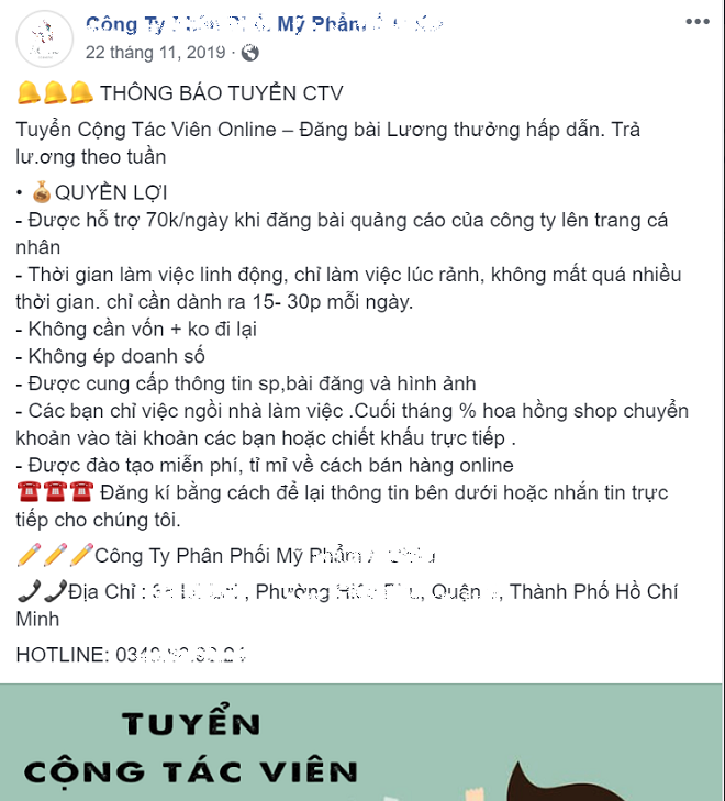 Chị Nguyễn Thịnh Mai Lan, ngụ Trường Chinh, Tân Bình, TP HCM ở nhà nuôi con nhỏ nên có mong muốn tìm kiếm một công việc nhẹ nhàng trên mạng để tăng thêm thu nhập. Sau khi than thở trên mạng xã hội về mong muốn này, chị được nhân viên một công ty mỹ phẩm tên Anh T. liên hệ, đề nghị làm đại lý của công ty. Yêu cầu làm đại lý rất đơn giản: chỉ việc đăng lên mạng thông tin sản phẩm của công ty, gồm các loại kem trắng da, hễ có người mua thì lấy hàng từ công ty về bán.