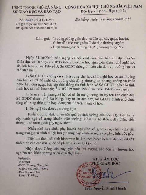 Liên quan đến vụ việc, bà Lê Thị Bích Thuận, Giám đốc Sở GD&ĐT TP Đà Nẵng khẳng định đây là văn bản giả mạo. Theo bà Thuận, cùng ngày, Sở đã có thông tin gửi các đơn vị, trường học về việc chủ động phương án phòng, chống và khắc phục hậu quả ngập, lụt. Nhắc nhở học sinh, phụ huynh và giáo viên cẩn trọng trong quá trình đi lại… Về trang Facebook lấy tên Sở GD&ĐT, bà Thuận cho biết sẽ tiến hành kiểm tra, phía Sở chưa từng có trang thông tin hoạt động trên mạng xã hội.