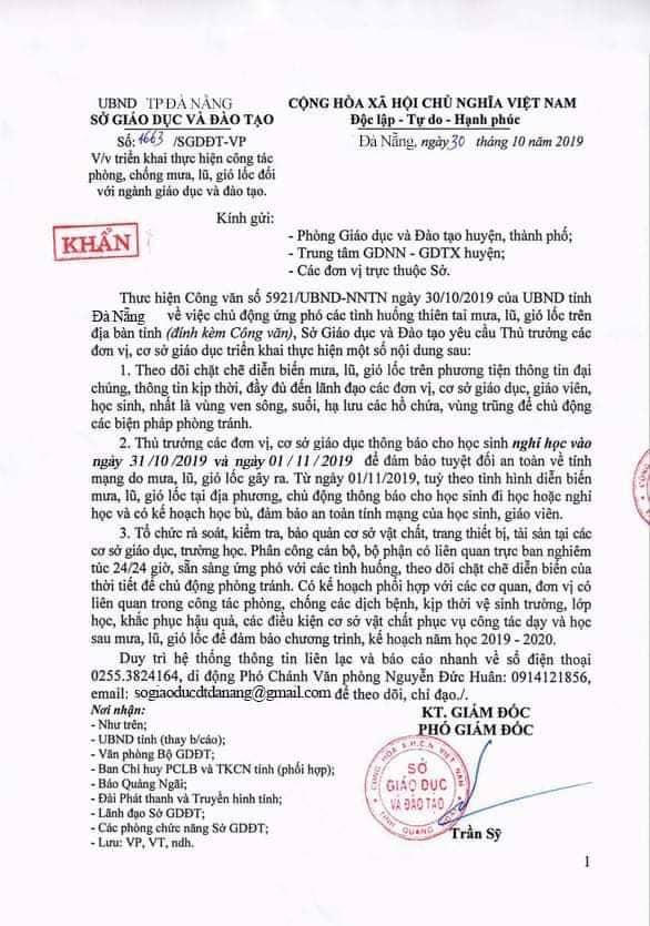 Ngày 31/10, trên trang Facebook có tên “Sở Giáo Dục Và Đạo Tạo Thành Phố Đà Nẵng” đăng tải văn bản thông báo cho học sinh nghỉ học do mưa lũ, gió lốc. Văn bản này có nội dung, ngày 30/10, sở GD&ĐT TP Đà Nẵng ra thông báo cho toàn bộ học sinh trên địa bàn thành phố nghỉ học từ ngày 31/10 đến hết ngày 1/11, để đảm bảo tuyệt đối an toàn về tính mạng.
