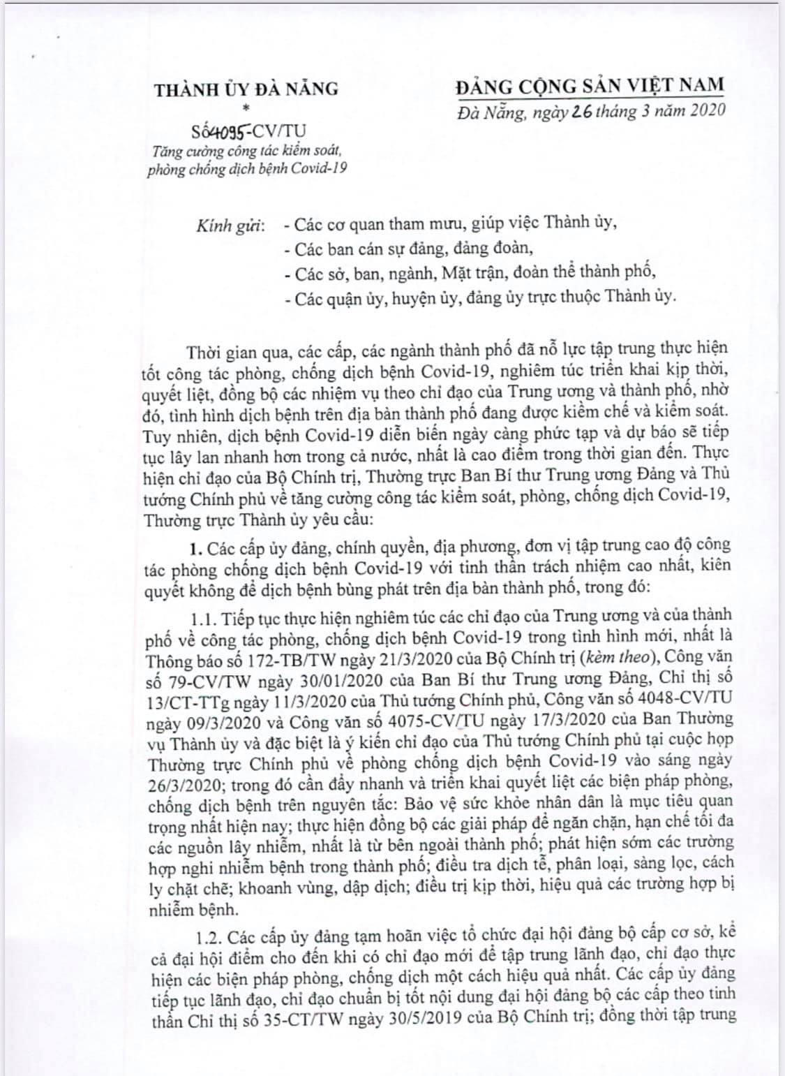 (PLVN) - Tối 26/3, Thành ủy Đà Nẵng có công văn về việc tăng cường công tác kiểm soát phòng chống dịch bệnh Covid-19 gửi đến các cơ quan tham mưu, giúp việc Thành ủy, ban cán sự đảng, các Sở ban ngành.