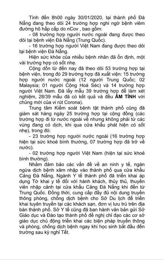 Cộng dồn đến thời điểm hiện nay đã có 25 trường hợp nghi ngờ được theo dõi tại bệnh viện, trong đó 23 trường hợp nước ngoài và 2 trường hợp người Việt Nam); Đã lấy mẫu các trường hợp để làm xét nghiệm, 15/15 mẫu đã có kết quả và đều âm tính với chủng mới của vi rút Corona).