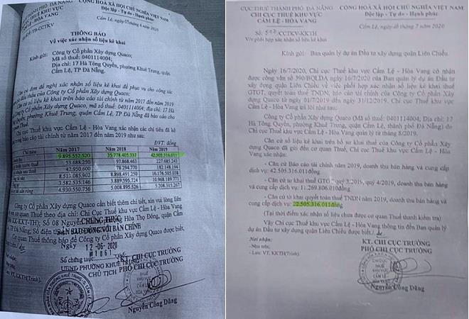 Qua tìm hiểu, phóng viên được biết Công ty CP Quaco kê khai nộp thuế tại hai cơ quan thuế Liên Chiểu và Cẩm Lệ, số liệu kê khai doanh thu nộp thuế và số liệu báo cáo tài chính của Công ty CP Quaco thực tế nhỏ hơn nhiều so với yêu cầu doanh thu của hồ sơ mời thầu. Và có dấu hiệu kê khai khống doanh thu nộp thuế và số liệu báo cáo tài chính, giả hóa đơn chứng minh doanh thu xây dựng.