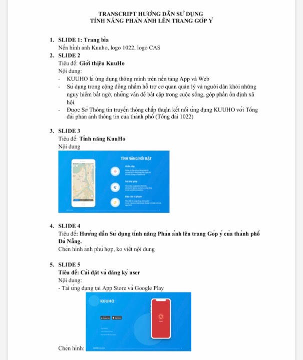 Hiên nay nội dung phản ánh trên ứng dụng KUUHO được tự động chuyển đến Cổng Góp ý Đà Nẵng (https://gopy.danang.gov.vn) để Cổng chuyển đến cơ quan chức năng xử lý. Kết quả sẽ được phản hồi đồng thời trên Cổng Góp ý và trên ứng dụng KUUHO.