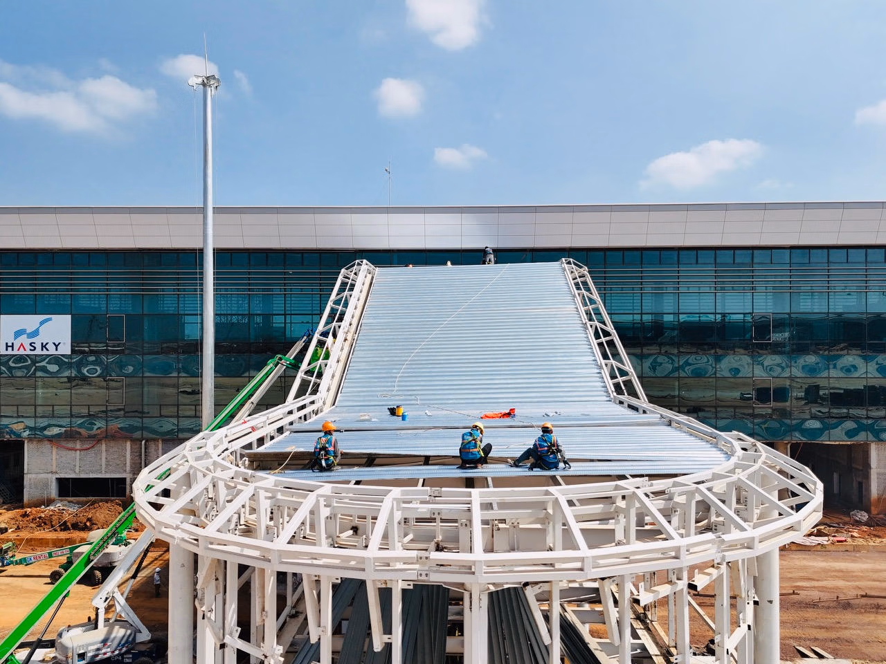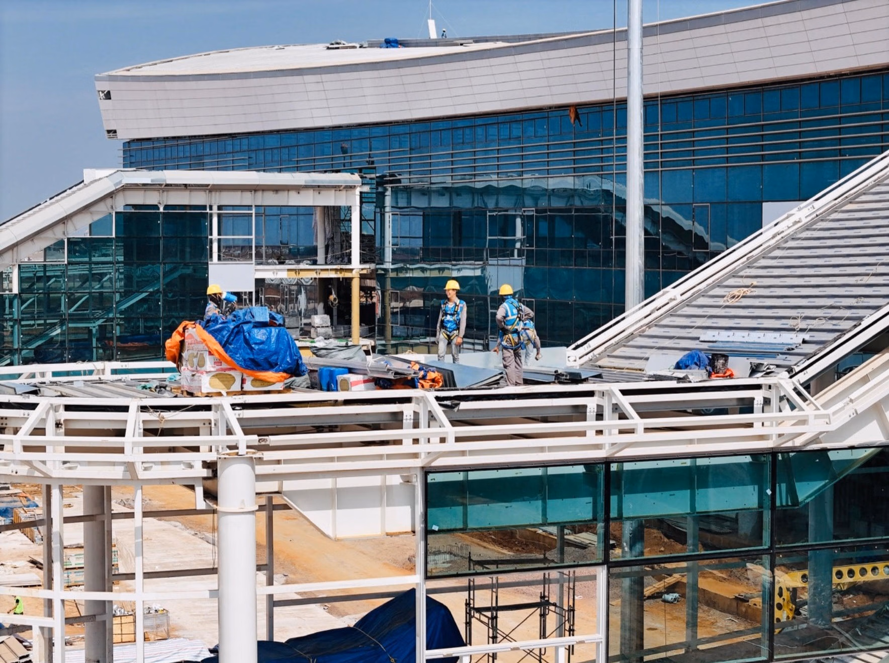 Tại khu vực nhà ga hành khách, được ví như “trái tim” của dự án, nhiều mũi thi công đang được triển khai đồng loạt. Trên cao, công nhân hoàn thiện phần mái; phía dưới, các tổ đội miệt mài thi công cơ điện, hạ tầng kỹ thuật, lắp đặt thiết bị. Mỗi công đoạn đều được tính toán kỹ lưỡng, bảo đảm sự ăn khớp giữa xây dựng và công nghệ theo tiêu chuẩn quốc tế.