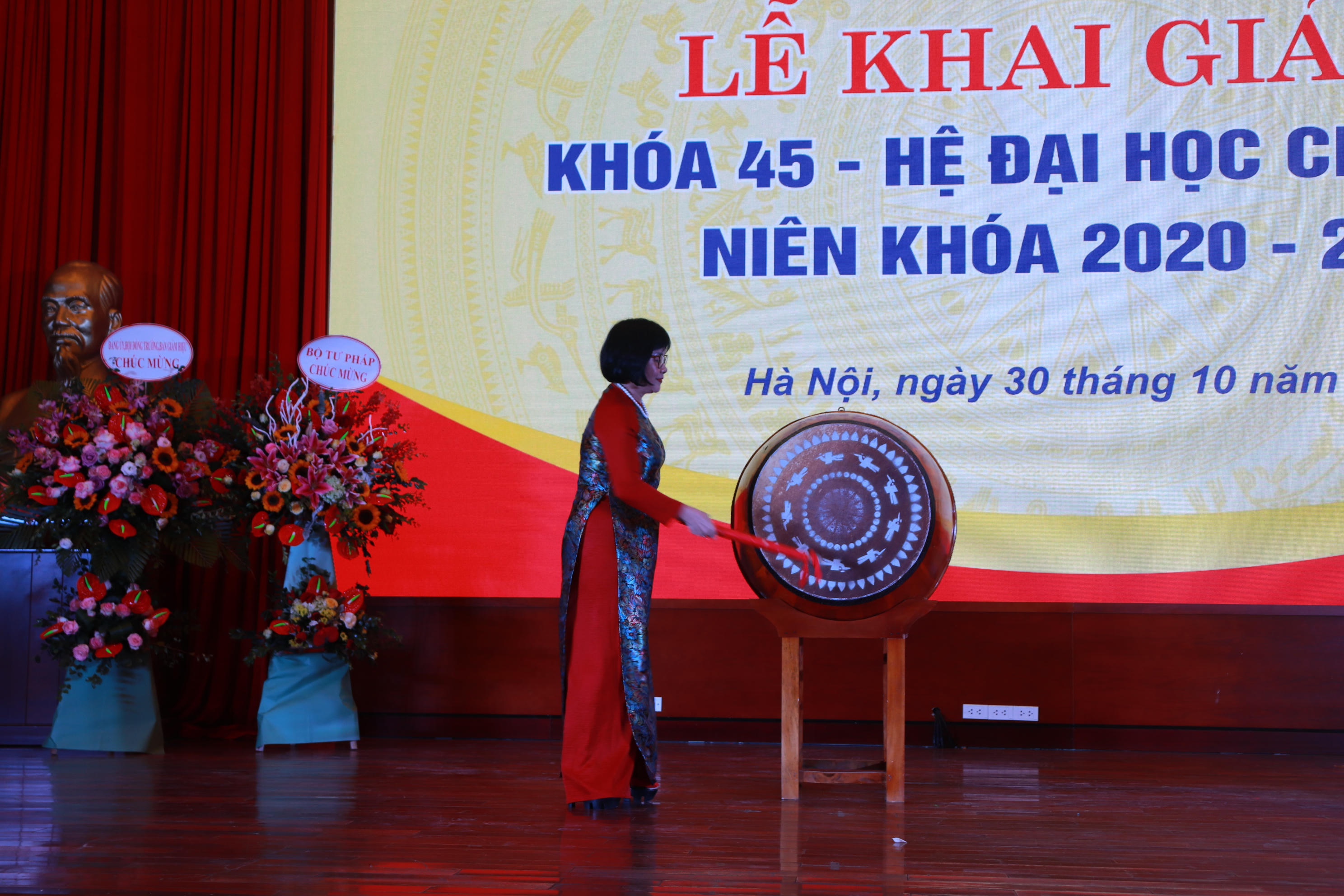 | Thứ trưởng Bộ Tư pháp Đặng Hoàng Oanh đánh trống khai giảng năm học mới tại Trường Đại học Luật Hà Nội sáng nay. |